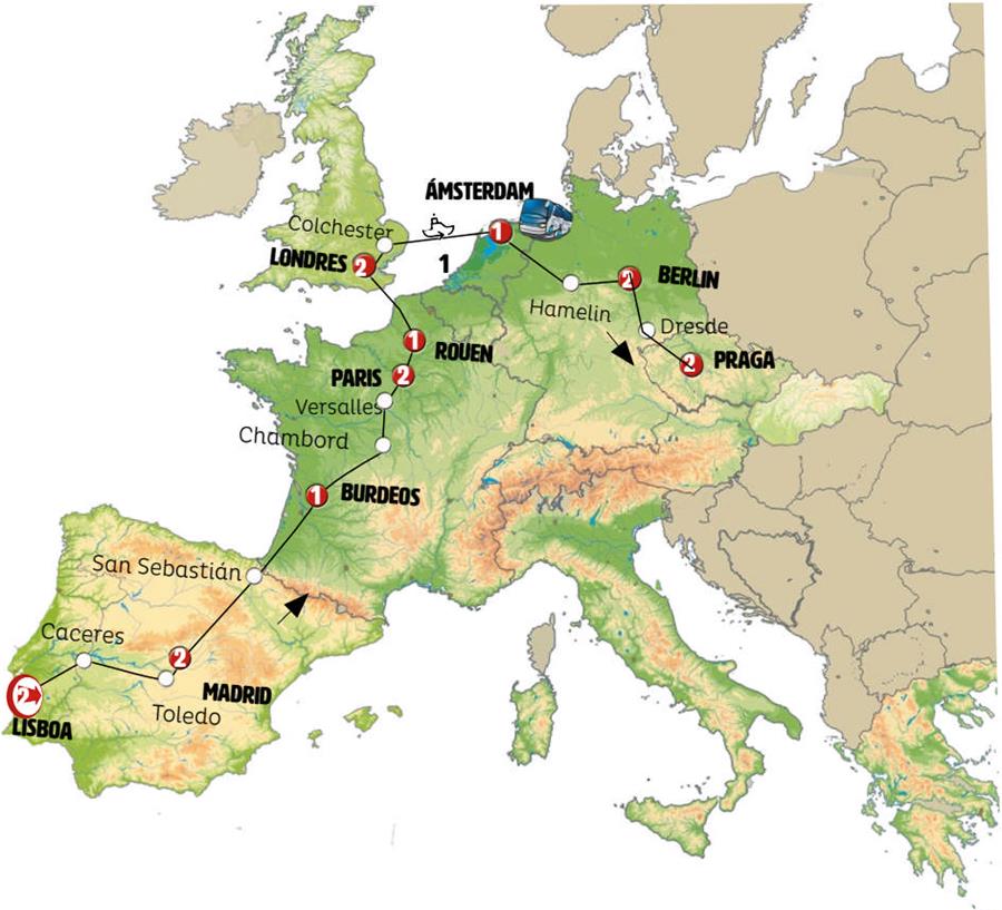 Nota importante: Debido a que el ferry utilizado tiene un número limitado de camarotes, en algunas ocasiones la etapa podrá sufrir modificaciones y se podrá ir desde Londres hasta Amsterdam bien en ferry diurno pernoctado en Amberes o bien en tren o avión a Amsterdam.