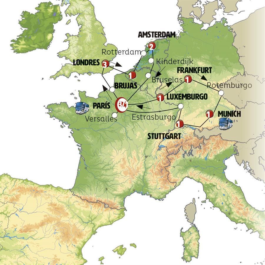 Saldremos de Londres, placidos paisajes de verdes colinas en el sur de Inglaterra. Tramites fronterizos antes de nuestro embarque hacia Calais. Agradable travesía en moderno ferry cruzando el Canal de la Mancha, ¡disfrute del ferry y del aire del oceano!. Llegada a Francia y continuacion hacia Bélgica. BRUJAS, la encantadora y mundialmente conocida ciudad flamenca de hermosos canales.