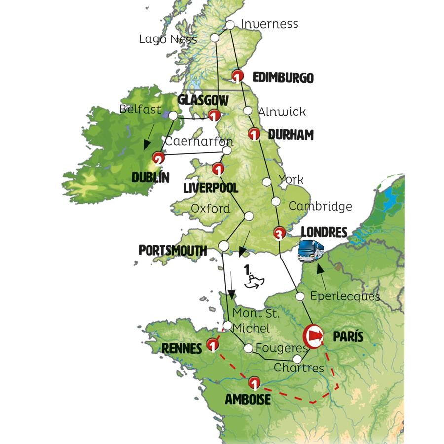 Desembarcamos en NORMANDÍA, viajamos hacia el MONT SAINT MICHEL, extraordinario lugar con su abadía rodeada por el mar. Tras este punto conocemos FOUGERES, pequeña ciudad de Bretaña a los pies de la mayor fortaleza de Europa, tiempo para pasear por sus calles adoquinadas medievales y almorzar. Continuamos a CHARTRES, una parada para admirar su magnífica catedral gótica. Continuamos hacia PARÍS. Llegada sobre las 20.30 hrs.
