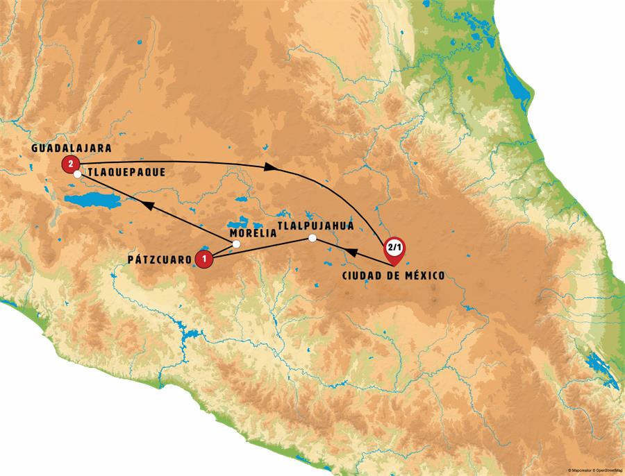 Saldremos hacia MORELIA, capital de Michoacán, ciudad declarada Patrimonio de la Humanidad por la UNESCO, conocida por su magnífica arquitectura de cantera rosa y su centro histórico, destacan la Catedral y la Plaza de Armas, su universidad se funda en 1540. Tiempo para pasear y almorzar. En nuestra ruta paramos en TLAQUEPAQUE, pueblo mágico de callejones llenos de música mariachi, música en vivo, venta de artesanías y gastronomía variada. Continuamos hacia GUADALAJARA, capital del estado de Jalisco, ciudad colonial cuna de los Mariachis y el Tequila. llegada al final de la tarde.