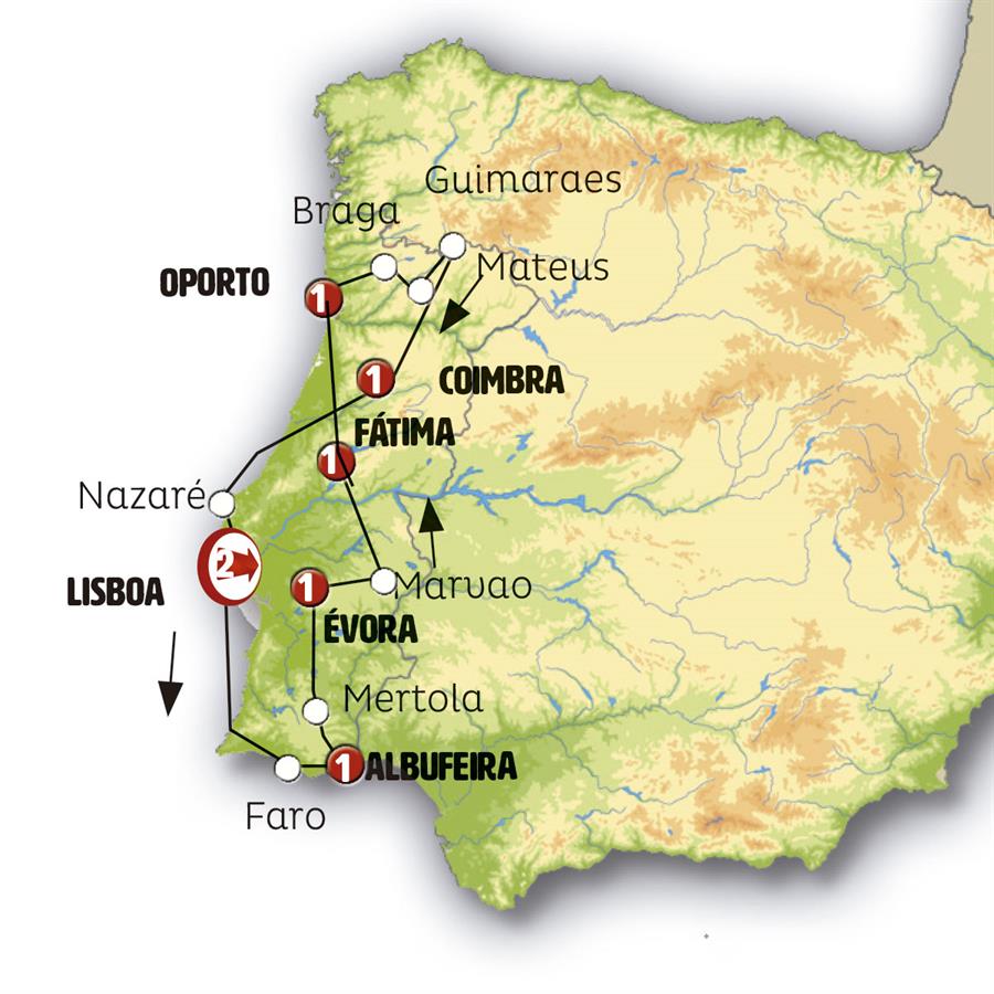Hoy viajamos entre bonitos paisajes de Alentejo. Paramos en MARVAO, pueblo amurallado muy pintoresco que nos ofrece una fantástica panorámica de la región. Tras ello, conocemos CASTELO DA VIDE con su gran castillo. Tendremos tiempo además para caminar por su antigua judería donde podemos visitar la sinagoga medieval (hoy museo) o por el laberinto de callejuelas de la población. Tras la hora del almuerzo continuamos a TOMAR, ciudad dominada por el Convento de Cristo, antiguo castillo-convento de los templarios, entrada incluida. Antes de llegar a Fátima, pararemos en ALJUSTREL, la aldea donde nacieron los tres pastorcitos que presenciaron a la Virgen. Podremos ver la casa de Lucía. Llegada a FÁTIMA y tiempo libre en el Santuario de Fátima donde, si lo desea, podrá presenciar la procesión de las velas (no se celebra en invierno). Cena incluida.