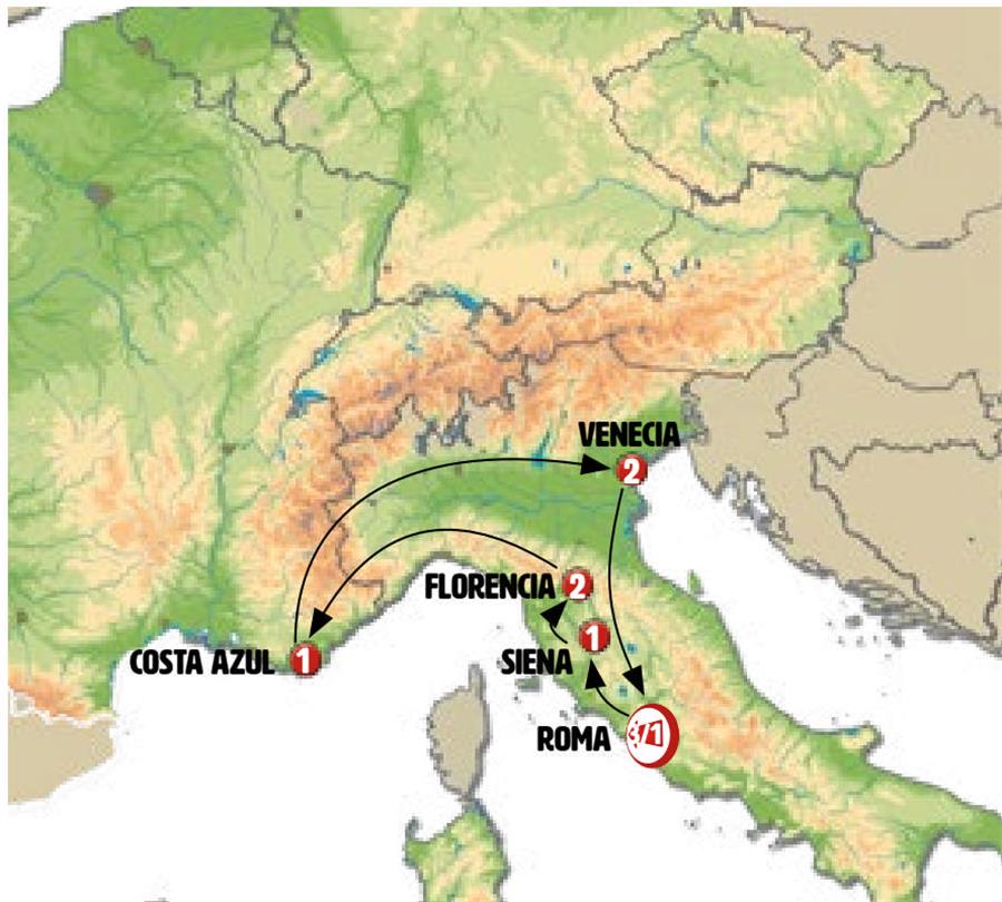 Salida de Florencia hacia PISA, tiempo para admirar su conjunto artístico donde se encuentra la famosa torre inclinada. La etapa que seguimos a continuación es de extraordinaria belleza paisajística siguiendo la Riviera Italiana. Llegada a SESTRI LEVANTE, encantadora pequeña ciudad turística junto al mar. Tiempo para almorzar y pasear. Continuación hacia la Costa Azul francesa. Llegada a media tarde a MONTECARLO, podrá conocer su histórico casino. Continuación a la NIZA. Llegada sobre las 20.00hrs.