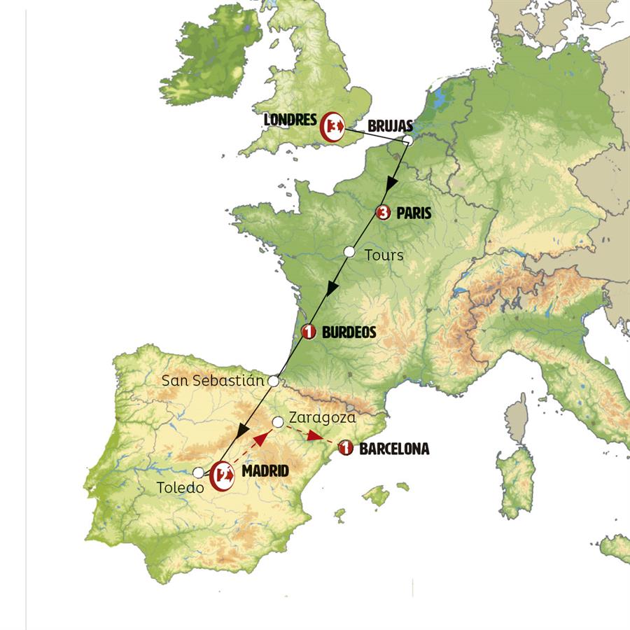 Salida de Burdeos. Paso al País Vasco. SAN SEBASTIÁN, tiempo para pasear y almorzar en esta atractiva ciudad junto al mar. Continuación hacia MADRID, donde a la llegada realizamos una breve visita nocturna de Madrid, seguida de un paseo a la plaza Mayor, Podremos aprovechar para tomar unos vinos en algún mesón.