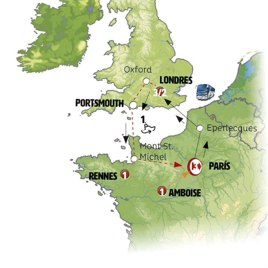 Desembarque en Normandía y continuación al MONT SAINT MICHEL “la maravilla”, tiempo para conocer la ciudad rodeada del mar y la abadía. Posteriormente en Bretaña viajamos a St. MALO, potentes murallas defienden la ciudad, tiempo para almorzar. Ya por la tarde un parada en DINAN, pueblo bretón lleno de encanto donde degustaremos una crepe con bebida. Seguimos ruta hacia RENNES, la capital de Bretaña con su interesante y monumental centro histórico.