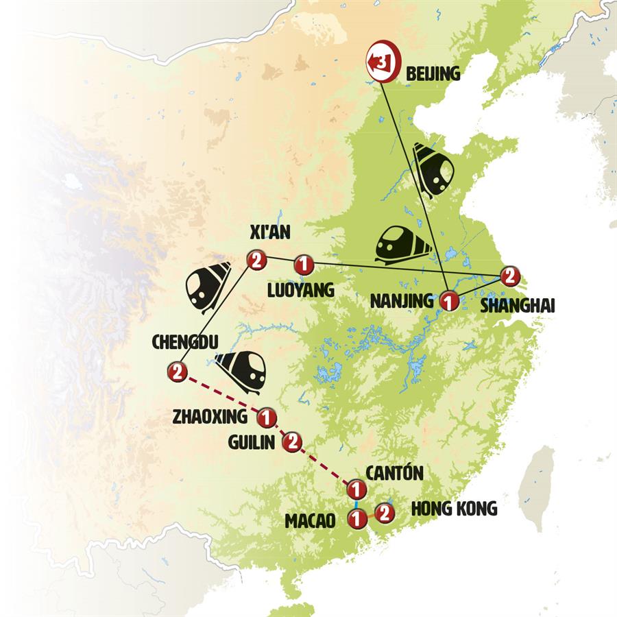 Tras el desayuno traslado a la estación de tren, tomamos uno de los modernísimos trenes de alta velocidad de China. A 300 km/hora, en aproximadamente 4 horas efectuamos los 1000 km y llegamos a NANJING, ciudad de ocho millones de habitantes considerada por muchos la mas agradable de China. Nos sorprenderá la actividad y la vida comercial de esta moderna metrópoli. Conoceremos la montaña purpurea, donde visitamos el mausoleo SUN YATSEN y el pintoresco templo Lingu. Tiempo libre posteriormente.