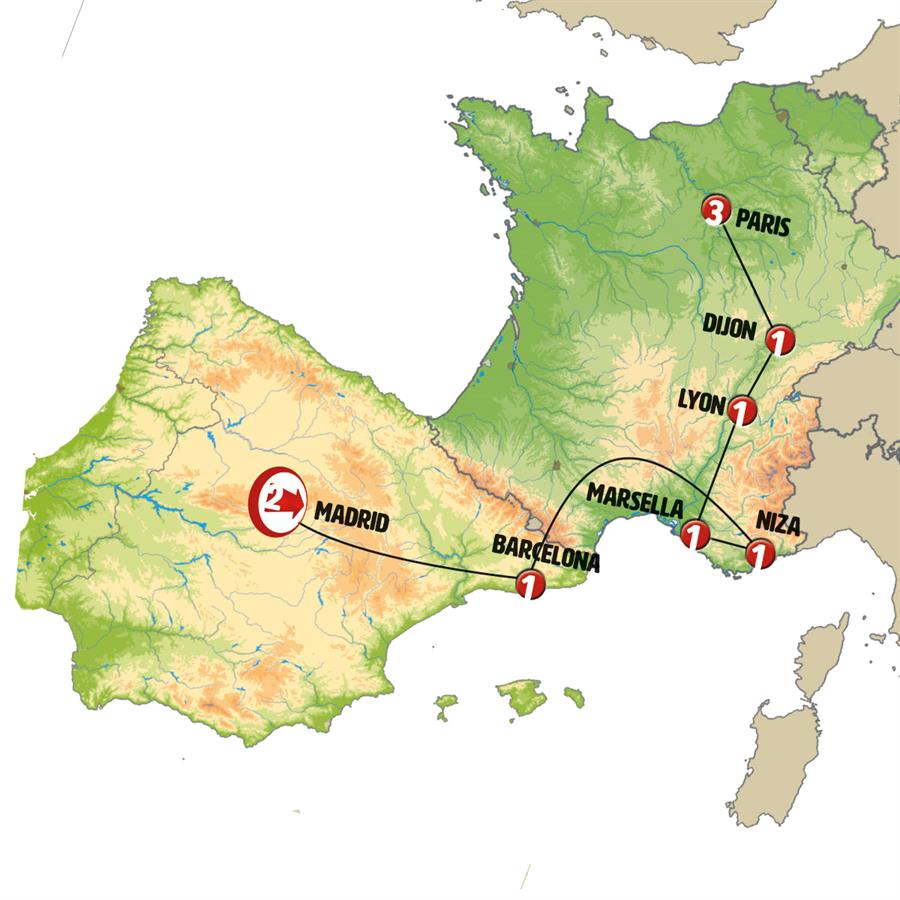 Nota: En algunas fechas el alojamiento podrá ser efectuado en un punto próximo a Niza en la Costa Azul.