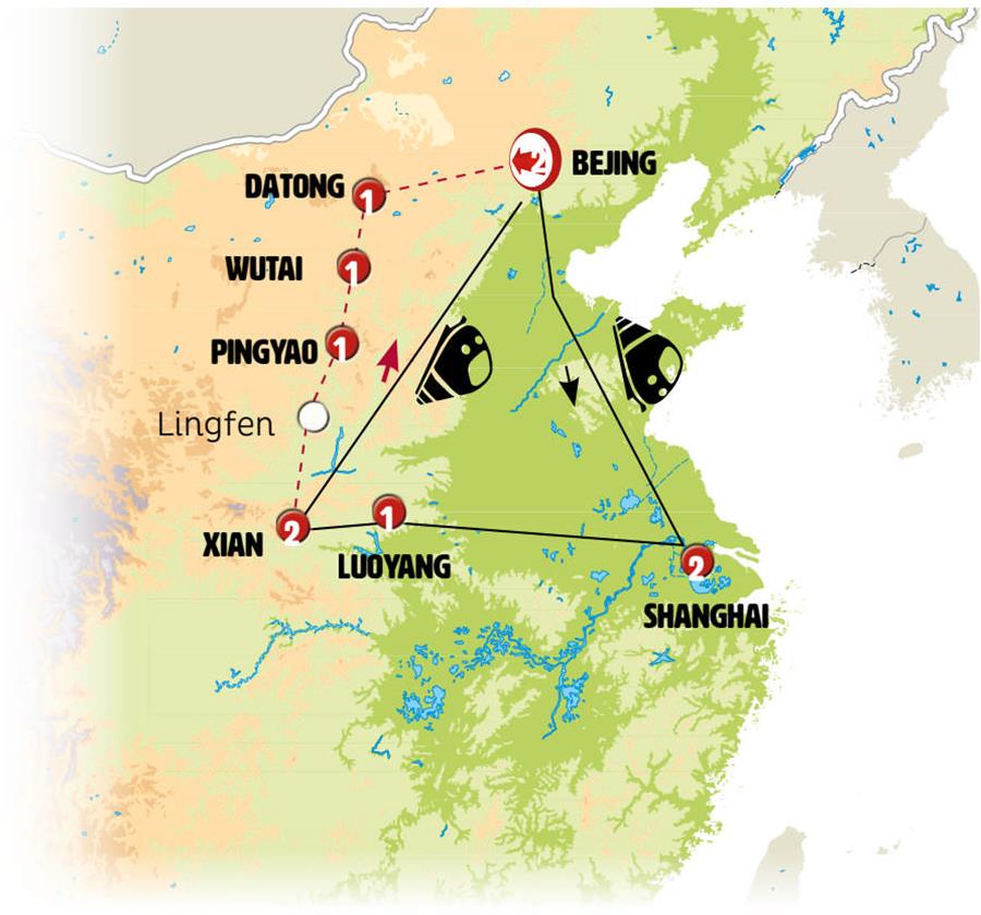 Traslado a la estación. Tomamos tren de alta velocidad (previsto tren con salida a las 7.17 hrs), en algo más de cinco horas, muchos tramos de bonitos paisajes, cubrimos los 1000 km que nos separan de LUOYANG. Almuerzo incluido. Conocemos las impresionantes cuevas budistas de LONGMEN, a lo largo de más de un kilómetro, en las pared rocosa del río se tallaron mas de 100.000 imágenes de Buda. Incluiremos un paseo en barco. Tras ello traslado a la ciudad vieja, penetramos a través de su impresionante muralla y podremos disfrutar de la gran actividad tradicional y sus iluminadas calles.
