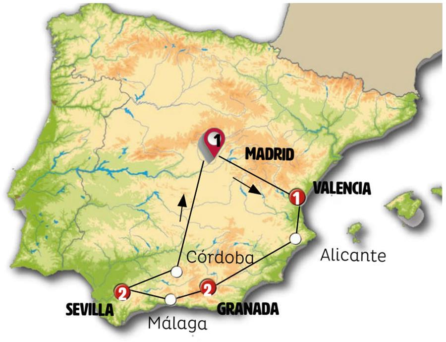 Salida de Madrid por la mañana.Viajamos hacia Castilla la Mancha. En nuestra ruta paramos en ALARCÓN, pequeño pueblo con impresionantes murallas medievales. Tiempo para dar un paseo. Seguimos a VALENCIA; llegada a mediodía. Tiempo para almorzar. Por la tarde efectuamos una visita con guía local de la tercera ciudad que mezcla lo moderno con lo histórico, conoceremos su centro histórico, la lonja, la catedral y también la vanguardista Ciudad de las Ciencias y los barrios modernos. Cena típica incluida.