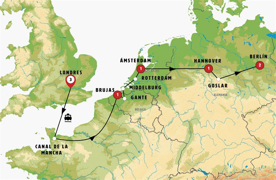 Saldremos de Londres, placidos paisajes de verdes colinas en el sur de Inglaterra. Tramites fronterizos antes de nuestro embarque hacia Calais. Agradable travesía en moderno ferry cruzando el Canal de la Mancha, ¡disfrute del ferry y del aire del oceano!. Llegada a Francia y continuacion hacia Bélgica. BRUJAS, la encantadora y mundialmente conocida ciudad flamenca de hermosos canales.