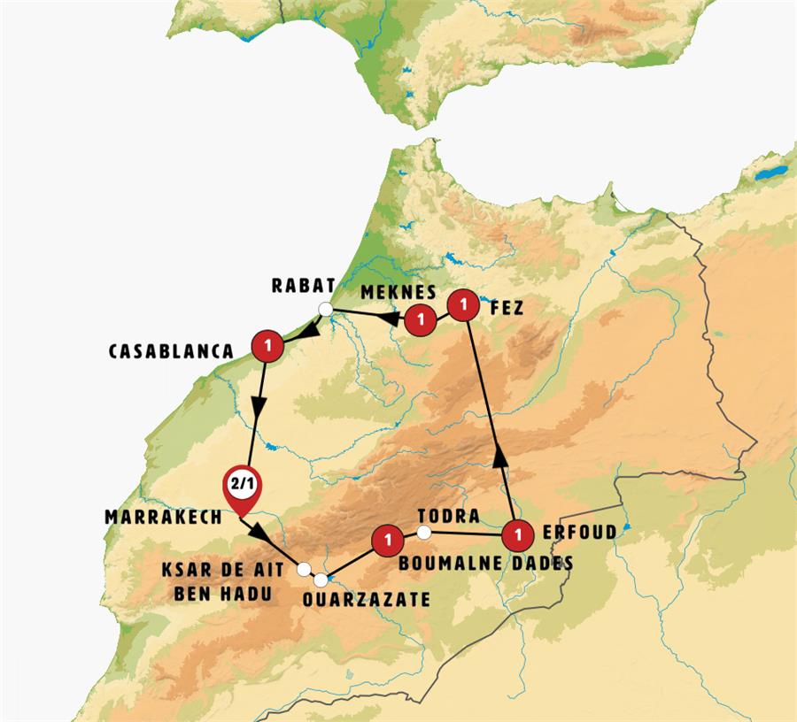 Nota: En muy raras ocasiones (durante el invierno) pueden existir problemas de nieve en los pasos del Atlas; si la carretera por este motivo está cortada, se haría programa alternativo (llegando o no al Sahara según pasos alternativos de montaña cerrados).