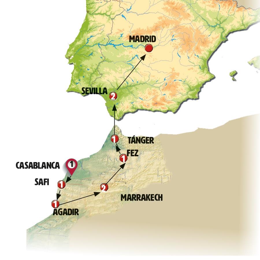 Salida hacia el norte de Marruecos por una moderna autopista. TANGER -Llegada al final de la tarde Cena y alojamiento.