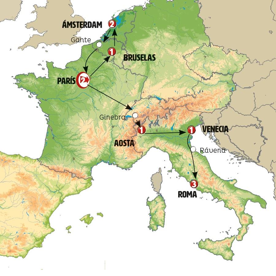 Siguiendo la laguna de VENECIA llegamos a RÁVENA donde podemos conocer el Mausoleo de Gala Placidia y la Basílica de San Vital. Tras ello cruzamos los Apeninos hacia ASÍS, tiempo libre para almorzar y conocer las basílicas. Continuación a ROMA, llegada al final del día.