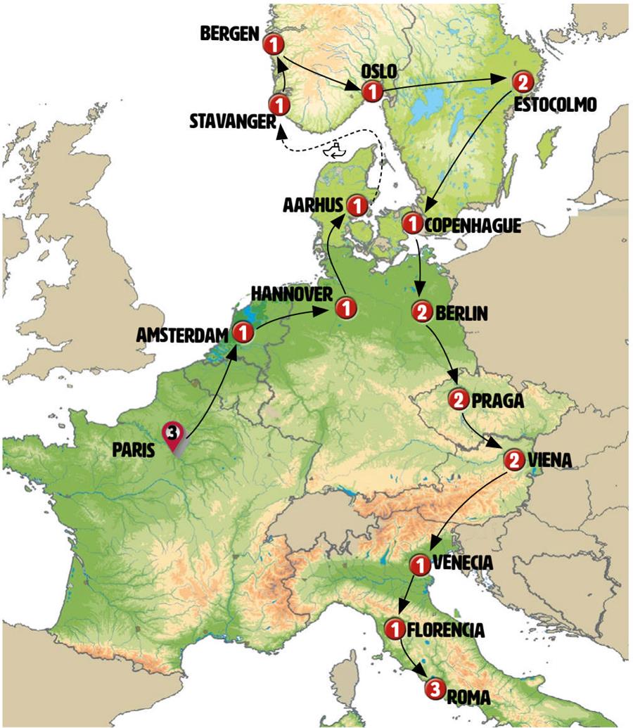 Nota: en el caso de que el número de pasajeros realizando el trayecto entre Copenhague/Berlín sea muy limitado, este podrá realizarse en línea regular de viajeros sin modificacarse el contenido de la etapa.