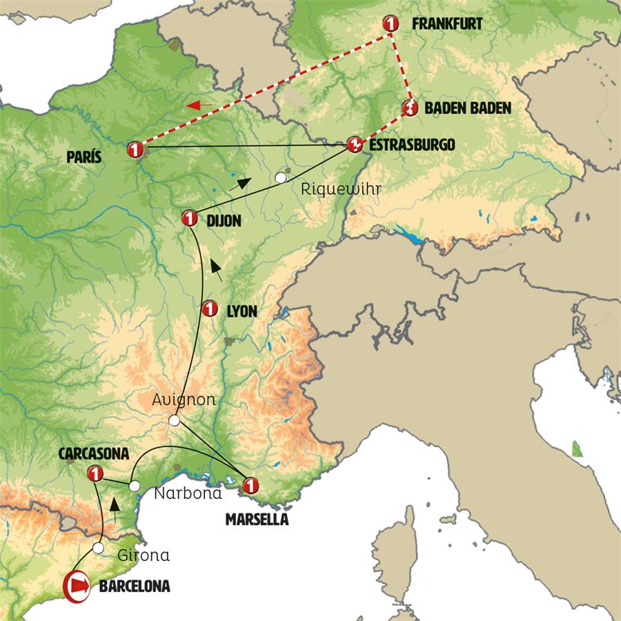 Todavía en la región de Borgoña paramos en BESANZON, ciudad de origen romano con bonito centro histórico y cuya ciudadela, del siglo XVII, domina la ciudad. Continuamos nuestra ruta hacia Alsacia, región francesa disputada a lo largo de los siglos entre Francia y Alemania, que mantiene un dialecto del alemán propio, “el alsaciano” y una arquitectura y tradiciones de gran arraigo germánico. Parada en COLMAR, ciudad con arquitectura única, con casas de madera de colores y canales que la atraviesan. Es conocida por su vino blanco y su gastronomía. Tendremos tiempo para almorzar y pasear con tranquilidad. Por la tarde conocemos uno de los más hermosos pueblos de Alsacia RIQUEWIHR, pueblo medieval con calles empedradas y casas de colores que parecen salir de un cuento de hadas y que inspiró escenas de la película de la Bella y la Bestia. Aprovecharemos para conocer una antigua bodega y hacer degustación de su vino con un dulce típico. ESTRASBURGO, llegada al final de la tarde. Sugerimos pasear por la zona de la catedral y la Petite France, lleno de lugares encantadores y pequeños restaurantes.