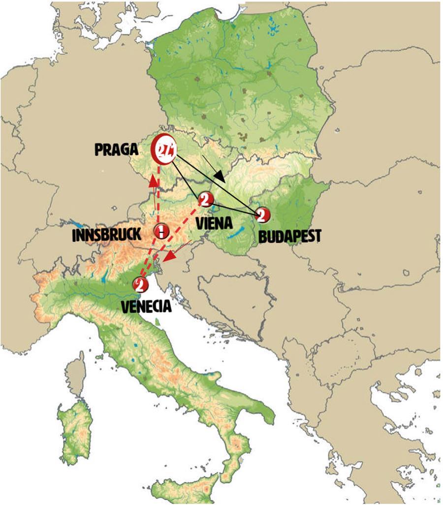 Salimos de VIENA, etapa de gran belleza paisajística. Viajamos entre altas montañas a ESLOVENIA. Breve parada en MARIBOR, un paseo junto a la catedral y el castillo, y tiempo para almorzar. En LIUBLJANA tiempo para pasear por el bonito centro de esta pequeña capital. Por la tarde viajamos hacia el mar Adriático, paso a ITALIA. VENECIA, llegada al final de la tarde. Alojamiento en la zona de Mestre.