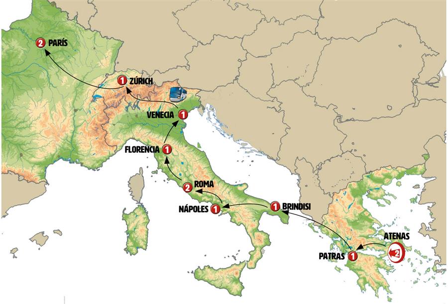 Tras el desayuno tomamos el puente de Rio Antirrio, espectacular puente colgante que conecta el Peloponeso con el continente griego. Viajamos por las regiones de Grecia Central y de Epiro. IGUMENITSA, llegada a esta ciudad portuaria. Tiempo para dar un paseo antes de tomar el moderno ferry (salida prevista a las 14.00 hrs) con el cual cruzamos el Mar Jónico hacia Italia. Llegada a BRINDISI al final del día (previsto a las 21.00 hrs). Alojamiento.