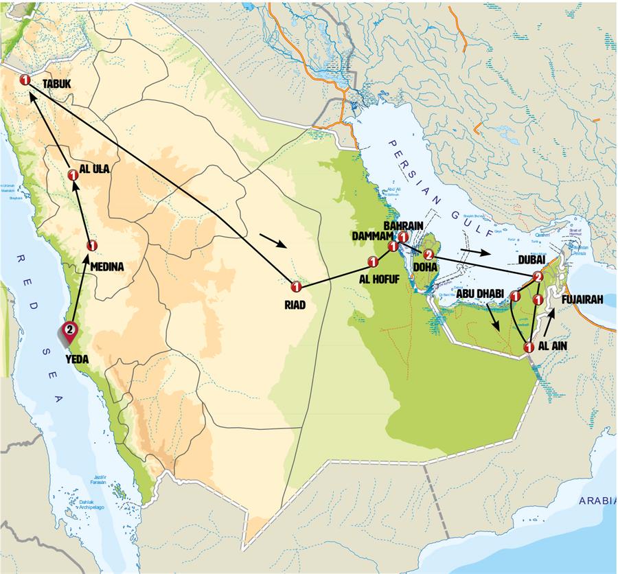 Día completo en Yeda. Con guía local conoceremos esta ciudad que nos sorprenderá por sus contrastes. En este momento una gran parte de la ciudad está siendo reconstruida para hacer de ella una gran megalópolis mundial. Destaca la construcción, entre otras cosas, de la Jeddah Tower que será el edificio más alto del mundo con más de mil metros de altura. Seguiremos hacia la Cornisa, con sus bonitas vistas, sus mezquitas junto al mar y sus zonas de recreo. Contemplaremos la Fuente del Rey Fahd, la más alta de su tipo en el mundo, sus chorros de agua alcanzan más de 300 metros de altura. Pararemos en el activo y pintoresco mercado de pescado. Incluiremos la entrada a “Al Taybat International city” un conjunto arquitectónico de gran belleza con sus muy interesantes museos de historia y etnografía. Volveremos a visitar el centro histórico, entrando por Bab Makkah -la puerta más importante de Jedah-. Conoceremos por dentro la elegante casa de Beit Sallum, hoy convertida en museo. Pasaremos también por el cementerio de Eva, donde la tradición dice que Eva, la mujer de Adán y primera mujer de la humanidad según la biblia, fue enterrada. Tiempo libre para almorzar en un centro comercial- Mall- donde podrá elegir entre los diversos restaurantes y tipos de comida que allí se ofrecen.
