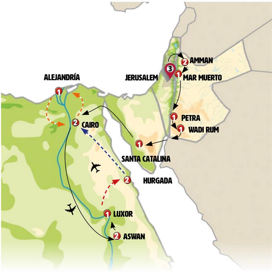 NOTA IMPORTANTE: Debido a circunstancias excepcionales o a un número reducido de participantes, puede ocurrir que crucemos directamente de Jordania a Egipto en barco, tomando el FERRY AQABA- TABA con una duración de algo más de dos horas. Durante la travesía en ferry, no habrá asistencia de ningún guía.