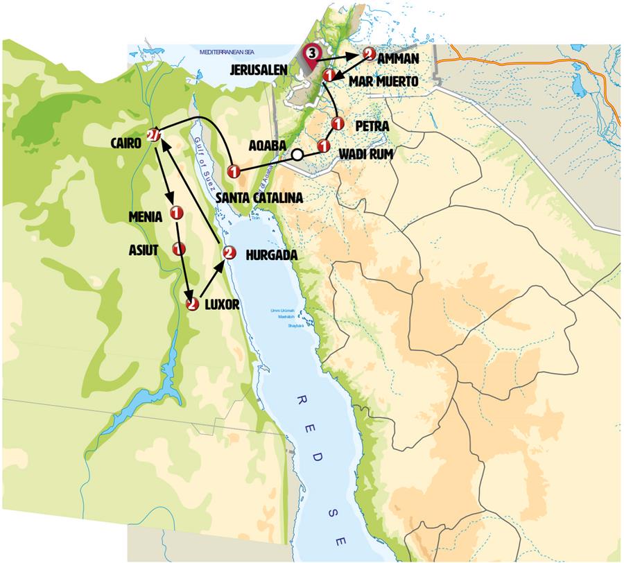 NOTA IMPORTANTE: Debido a circunstancias excepcionales o a un número reducido de participantes, puede ocurrir que crucemos directamente de Jordania a Egipto en barco, tomando el FERRY AQABA- TABA con una duración de algo más de dos horas. Durante la travesía en ferry, no habrá asistencia de ningún guía.