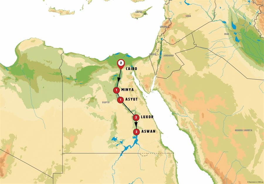 Arrival to ASWAN. Possibility of getting the optional tour to Abu Simbel (visit NOT included in the itinerary), located two hundred and eighty kilometers from Aswam, visit the western desert and the temples carved on the cliff by Ramses II during the twelfth century BC, with 20 meters high statues, dedicated to the god Amon Ra, and the Temple of Nefertari, dedicated to the goddess Hathor. Visit the Red Granite quarry where is the famous 41 meters high Unfinished Obelisk. We will also visit the Aswan Dam, one of the largest in the world, which created Lake Nasser with a length of more than 500 km. We will visit the beautiful Temple of Philae dedicated to the goddess Isis and located on a small island that can only be accessed by boat. In the afternoon, a felucca cruise on the Nile, typical sailing boats in the area, heading to the island of Kitchener where the Botanical Garden is located. Full board. Accommodation on board.