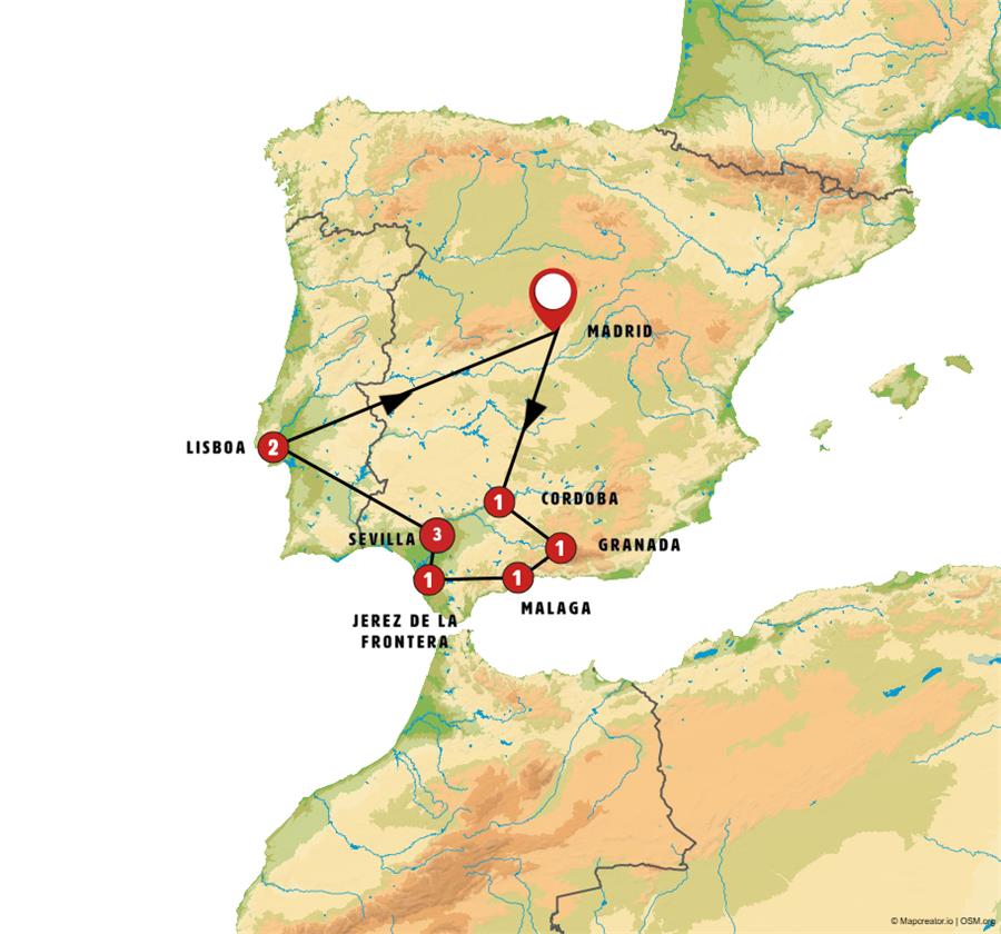 Saldremos temprano de Portugal, atravesamos la bonita region de el Alentejo. Parada para un café en ESTREMOZ, encantadora ciudad con castillo medieval, calles adoquinadas y arquitectura y ambiente tranquilo que reflejan la autenticidad portuguesa. Paso a España. En CÁCERES podrá almorzar y pasear por su centro histórico, uno de los conjuntos urbanos medievales y renacentistas mejor conservados del mundo. Continuación a MADRID, llegada al final del día.