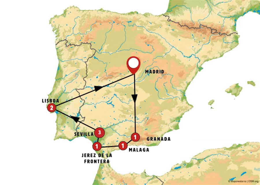 Hoy disfrutaremos de una de las etapas más hermosas del viaje, recorriendo los Pueblos Blancos y las serranías andaluzas. Partimos temprano hacia PUERTO BANÚS en Marbella, uno de los puertos deportivos más lujosos de España, famoso por sus yates y boutiques de alta moda. Tras un paseo, seguimos hacia SETENIL DE LAS BODEGAS, espectacular pueblo blanco con casas incrustadas en la roca, y luego a RONDA, ciudad pintoresca situada sobre el desfiladero del Tajo. Almuerzo típico incluido y tiempo para un paseo antes de visitar la plaza de toros, una de las más antiguas y monumentales de España (entrada incluida). Continuamos hacia OLVERA, conocido por su castillo árabe, su iglesia neoclásica y sus casas de balcones típicos llenos de flores, estampa típica andaluza. Incluimos la entrada al castillo y al museo. Llegada a JEREZ DE LA FRONTERA al final de la tarde, donde recomendamos pasear por el centro histórico y disfrutar de tapas en los "tabancos".