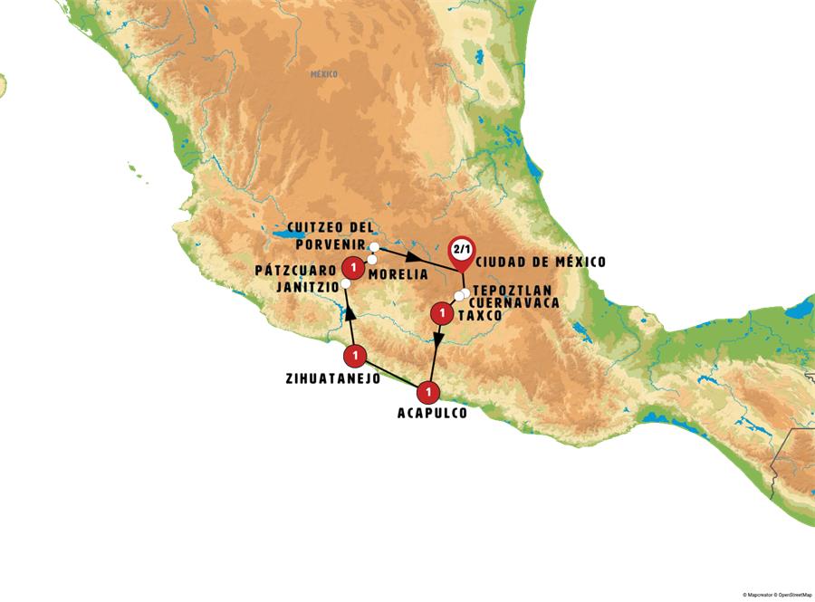 Nota: En fechas de muy alta temporada pueden existir dificultades de alojamiento en Zihuatanejo, en estos casos podríamos salir al final de la tarde para alojarnos en la ciudad Lázaro Cárdenas.