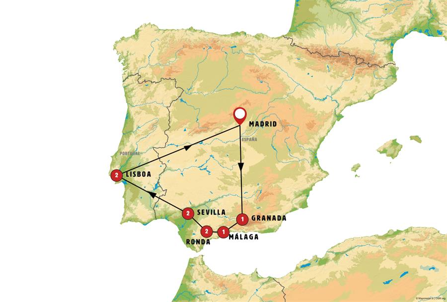 Salida de Madrid al comienzo de la mañana. Viajamos hacia el sur atravesando La Mancha, con parada en PUERTO LÁPICE, un pueblo manchego que evoca a Don Quijote. Entraremos por Despeñaperros en Andalucía. GRANADA, llegada. Almuerzo incluido. Por la tarde, si usted adquirió el viaje con visita a la Alhambra incluida, visitaremos con guía local el inmenso Palacio de la Alhambra y sus bellos jardines del Generalife, construidos en época árabe.NOTA MUY