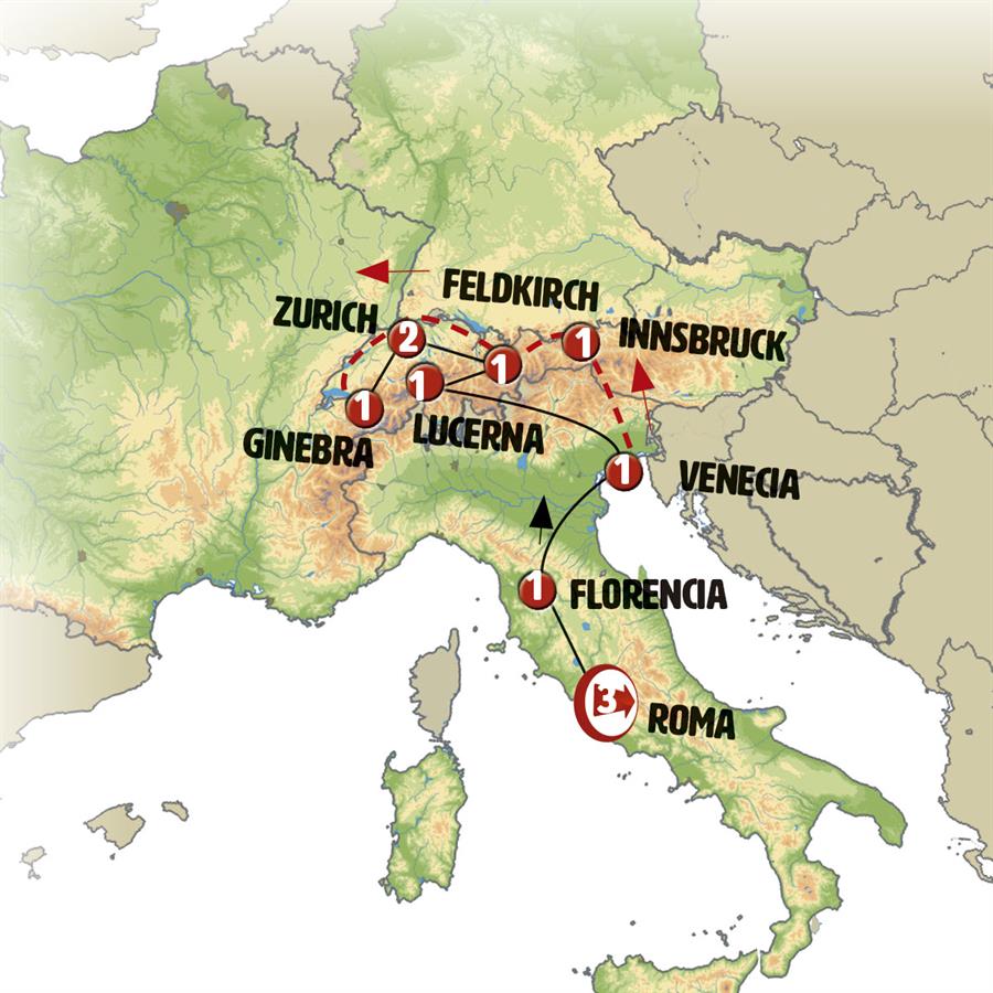 Salimos contorneando el lago de los Cuatro Cantones hacia EINSIEDELN, cuya inmensa abadía barroca es el principal punto de peregrinación en Suiza. Después, continuaremos hacia el este de Suiza, donde en HEIDIDORF conoceremos la Casa de Heidi (entrada no incluida), un pintoresco lugar entre hermosos paisajes, al cual accedemos por un sendero peatonal. Entraremos en el pequeño país independiente de Liechtenstein y, en su capital, VADUZ, a la sombra de su castillo, dispondréis de tiempo para pasear y almorzar. Posteriormente, nos dirigiremos a la cercana ciudad de FELDKIRCH, en Austria, junto a la frontera con Suiza, Liechtenstein y Alemania; una encantadora ciudad amurallada con un hermoso casco medieval y su castillo. Tiempo libre.