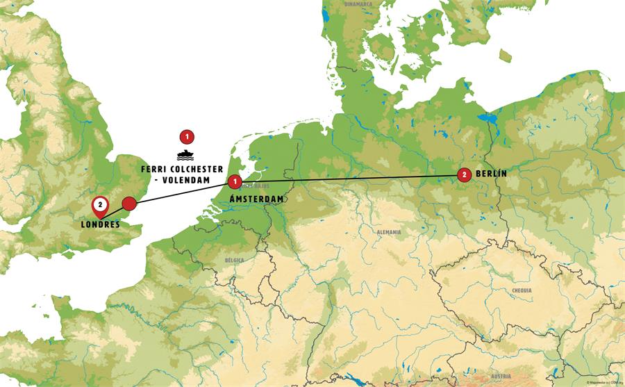 Nota importante: Debido a que el ferry utilizado tiene un número limitado de camarotes, en algunas ocasiones la etapa podrá sufrir modificaciones y se podrá ir desde Londres hasta Amsterdam bien en ferry diurno pernoctado en Amberes o bien en tren o avión a Amsterdam.