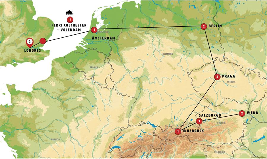 Nota importante: Debido a que el ferry utilizado tiene un número limitado de camarotes, en algunas ocasiones la etapa podrá sufrir modificaciones y se podrá ir desde Londres hasta Amsterdam bien en ferry diurno pernoctado en Amberes o bien en tren o avión a Amsterdam.