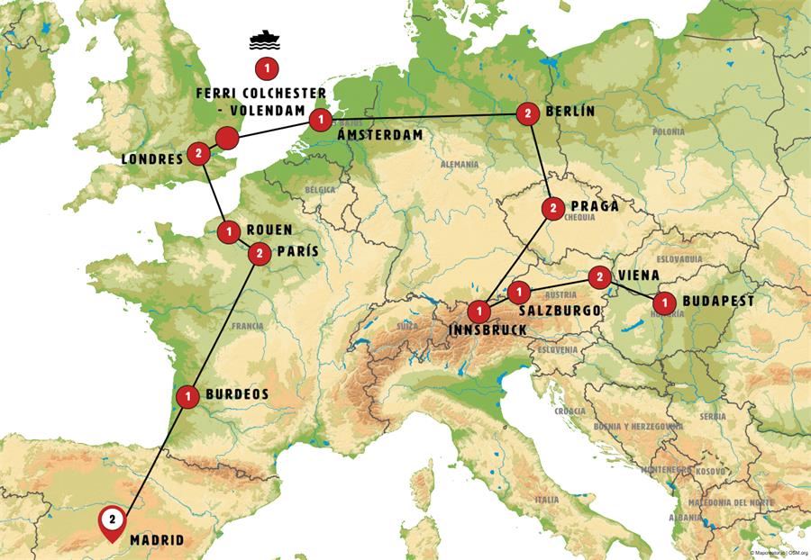 Nota importante: Debido a que el ferry utilizado tiene un número limitado de camarotes, en algunas ocasiones la etapa podrá sufrir modificaciones y se podrá ir desde Londres hasta Amsterdam bien en ferry diurno pernoctado en Amberes o bien en tren o avión a Amsterdam.