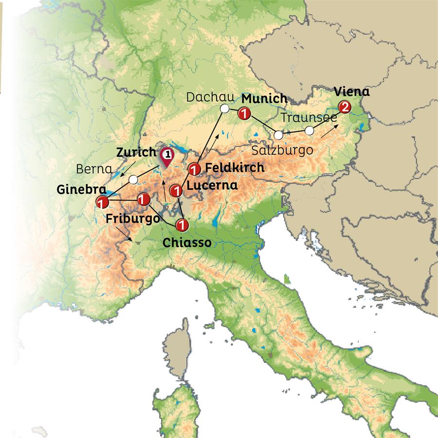 Salimos contorneando el lago de los Cuatro Cantones hacia EINSIEDELN, cuya inmensa abadía barroca es el principal punto de peregrinación en Suiza. Después, continuaremos hacia el este de Suiza, donde en HEIDIDORF conoceremos la Casa de Heidi (entrada no incluida), un pintoresco lugar entre hermosos paisajes, al cual accedemos por un sendero peatonal. Entraremos en el pequeño país independiente de Liechtenstein y, en su capital, VADUZ, a la sombra de su castillo, dispondréis de tiempo para pasear y almorzar. Posteriormente, nos dirigiremos a la cercana ciudad de FELDKIRCH, en Austria, junto a la frontera con Suiza, Liechtenstein y Alemania; una encantadora ciudad amurallada con un hermoso casco medieval y su castillo. Tiempo libre.