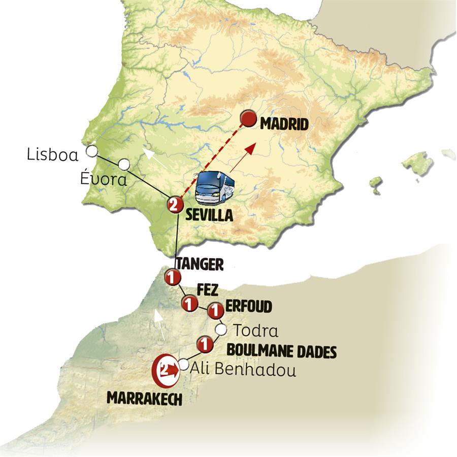Nota: En muy raras ocasiones (durante el invierno) pueden existir problemas de nieve en los pasos del Atlas; si la carretera por este motivo está cortada, se haría programa alternativo (llegando o no al Sahara según pasos alternativos de montaña cerrados).