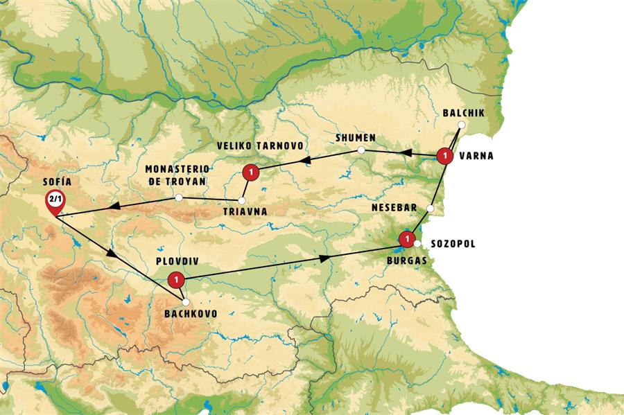 Tras el desayuno saldremos hacia NESEBAR, una de las ciudades más antiguas de Europa, declarada Patrimonio de la Humanidad por la UNESCO. Fundada por los tracios fue posteriormente ciudad griega, romana y bizantina. Su casco histórico está en una pequeña península en el Mar Negro unida al continente por un istmo y conserva 40 iglesias construidas entre los siglos V y XVIII. Tiempo para conocer la ciudad y almorzar. Seguimos el litoral del Mar Negro hacia el Monasterio de Aladzha (entrada incluida), un lugar cargado de espiritualidad y leyendas, rodeado de bosques que realzan su misterio y que impresiona con sus capillas y celdas excavadas en la roca. Continuamos hacia el palacio y los jardines de Balchik (entrada incluida), antigua residencia de verano de la Reina Maria de Rumania. Llegada al final de la tarde a VARNA, la tercera ciudad de Bulgaria, con un centro agradable lleno de vida y un gran parque junto al mar.